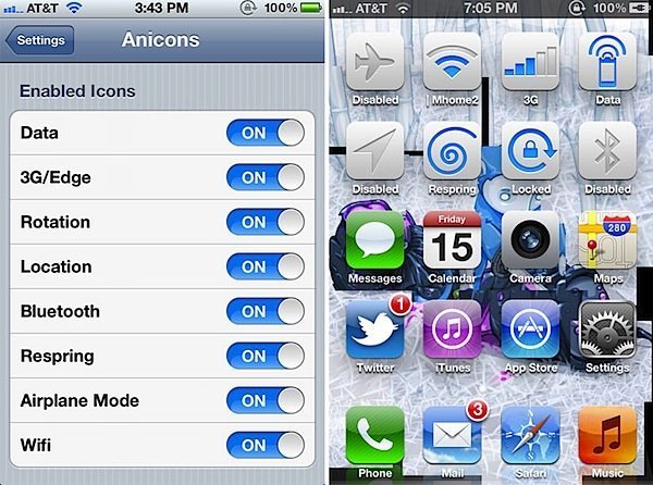 A simple but handy new Cydia tweak called Anicons brings animated settings toggles to the SpringBoard. These toggles look and work just like SBSettings along with a touch of animation such as animated signal strength and on / off visuals. There are currently 8 toggles to choose from and can easily be moved around and arranged like the app icons on your iOS home screen.