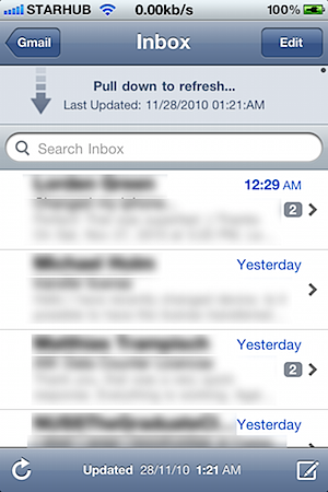 ‘Pull to Refresh for Mail’ is a cool new tweak which is now available for FREE on Cydia. It enables pull down to refresh feature within the default Mail.app of your iPhone or iPod touch. Once you install the tweak from Cydia, it allows you pull your inbox and let go to quickly refresh it and check for any new mail, much like the official twitter app where it refreshes your timeline.