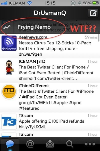Official Twitter app for iPhone / iPad just got updated to v3.3 and with it came a big annoyance. Yes thats right, I call it a “big” annoyance coz it actually screws up the whole minimalistic design of Twitter iPhone app. Its called the “Quick Bar” or a trend bar, whatever they want us to call it but most definitely, we are not buying it at all. Its basically a translucent notification bar at the top of your timeline that shows Twitter’s beloved and promoted trends (or Ads) which are most of the time, pretty lame. What’s more annoying is that it keeps showing up each time you tap the timeline tab or even when switching between different tabs, duh!