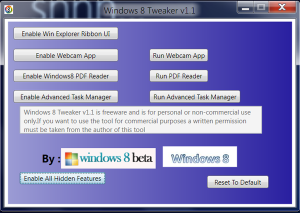A cool tweak has just hit the scene, courtesy of Windows8Beta and Windows8Search. Its called the Windows 8 Tweaker and as the name implies it tweaks the OS in a way that it unlocks some really cool “hidden features”. These features also include the hidden Windows 8 Ribbon UI which can now easily be enabled with this tool. Below is the list of features you can get on Windows 8 by this handy little tweak.