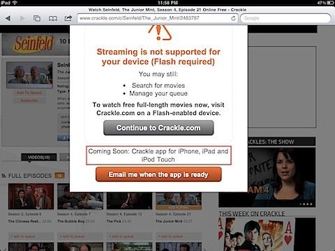 Yet another FREE solution for watching tons of movies and TV shows on your beloved iPhone, iPod touch and the iPad is soon making its way to the AppStore. An official Crackle.com is going be released with full access to Sony’s huge library of films and shows on the Crackle website optimized for all iOS devices. Right now, if you point your mobile Safari to Crackle.com, a splash screen pops up saying a “Crackle iOS app is Coming Soon!”.