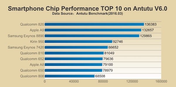 AnTuTu is a popular benchmarking app available for both iOS and Android. During testing, it has been seen that the Qualcomm 820 chip beats Apple’s A9 by 3,726 points. This lead from Qualcomm’s processors will also be evident in other flagship phones such as LG G5 which use the same chip.