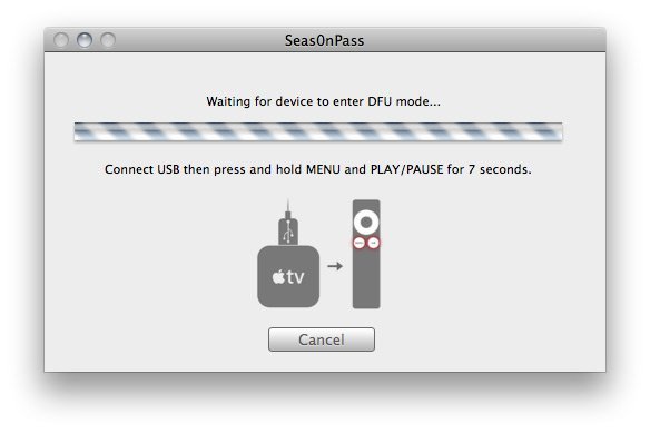 When prompted, simply connect your AppleTV 2G using a micro-USB cable (leave power disconnected), and hold both the ‘MENU’ and ‘PLAY/PAUSE’ buttons for 7 seven seconds.