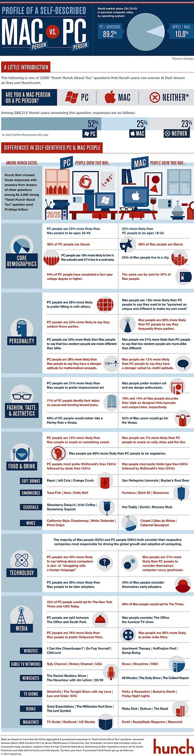 A very interesting depiction of how users of Mac and PC differ not only in their chosen computing platforms but also their tastes in food, fashion and media has been put into the shape of an infographic which is given below. Check it out for complete insights and data obtained from a pretty big number of PC / Mac users. Like any comparison / infographic, there are exceptions to every trend. We’d love to here your comments if you think the analysis is not so accurate after all!