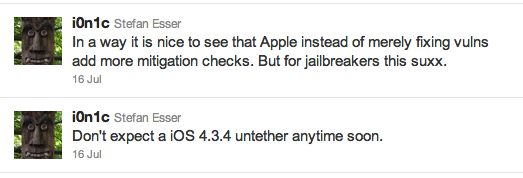 @i0n1c, the iOS developer and hacker behind untethered jailbreak exploit discovered in iOS 4.3.1 till 4.3.3 has made it clear not to expect a similar untethered jailbreak for iOS 4.3.4 in the coming few weeks. As Apple released iOS 4.3.4, it patched not only the PDF vulnerability exploited by @comex in JailbreakMe 3.0 for iPad 2 jailbreak but also patched @i0n1c’s untethered exploit. Even though iOS 4.3.4 can be jailbroken with latest Redsn0w on iPhone 4 / 3GS, iPod touch 3G/4G and iPad 1, it is however a tethered one.