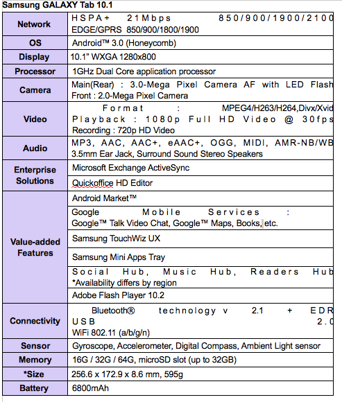 Specs: Both 8.9 and 10.1 Galaxy Tabs will pack 1GHz dual-core Tegra 2 processors with memory options of 16GB, 32GB and 64GB and come in both 3G and WiFI only versions. Both the tablets have 3 megapixel back camera with LED flash, capable of shooting 720p HD video while the front cameras have a 2 megapixel lens. The tablets will also have microSD slots for memory expansion and 3.5mm headphone jacks. Both models have WXGA TFT LCD display (1280 x 800) capable of seamless 1080p HD video and Flash 10.2 playback with surround-sound stereo speakers. Here are the complete specs of both models: