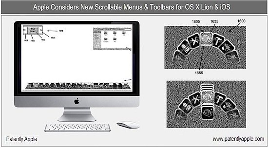 According to Patently Apple, Apple has just recently filed for a new patent which strongly suggests that the upcoming Mac OS X Lion and may be even the future versions of iOS could be feature ‘scrolling menus and toolbars’. This way, users would be able to bring up a menu or a toolbar related to any specific application or environment in which they are working at that time and easily scroll through them to select a specific command.
