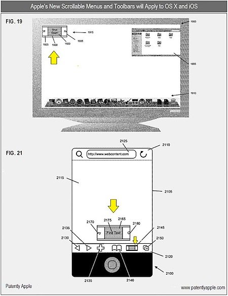 There is also indication that these toolbars or scrollable menus may consist of ‘text-only’ commands as well as some icons. In short, this could actually change the way we work and interact with our operating systems. For instance, on our current Mac OS, we use a drop down menu to lets say, save a file or open and edit a document. In case of iOS, we use popup menus by tapping and holding for a few seconds. With this patent, all this may change for good. It’s tool early to precisely predict how easy the new scrolling toolbars solution would actually be in Mac OS, but this can for sure be extremely handy in case of iOS devices.