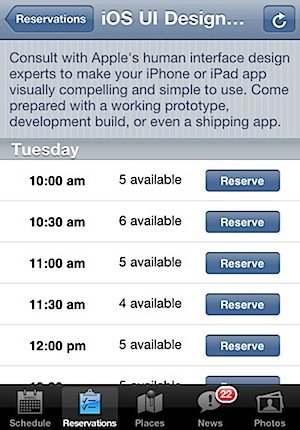The WWDC 2011 app allows you to make a reservation at the User Interface, App Review, iTunes Connect, Program Support, or Developer Publication lab. Once you make a lab reservation, it will appear in the schedule section of the app when you filter your view by Favorites.
